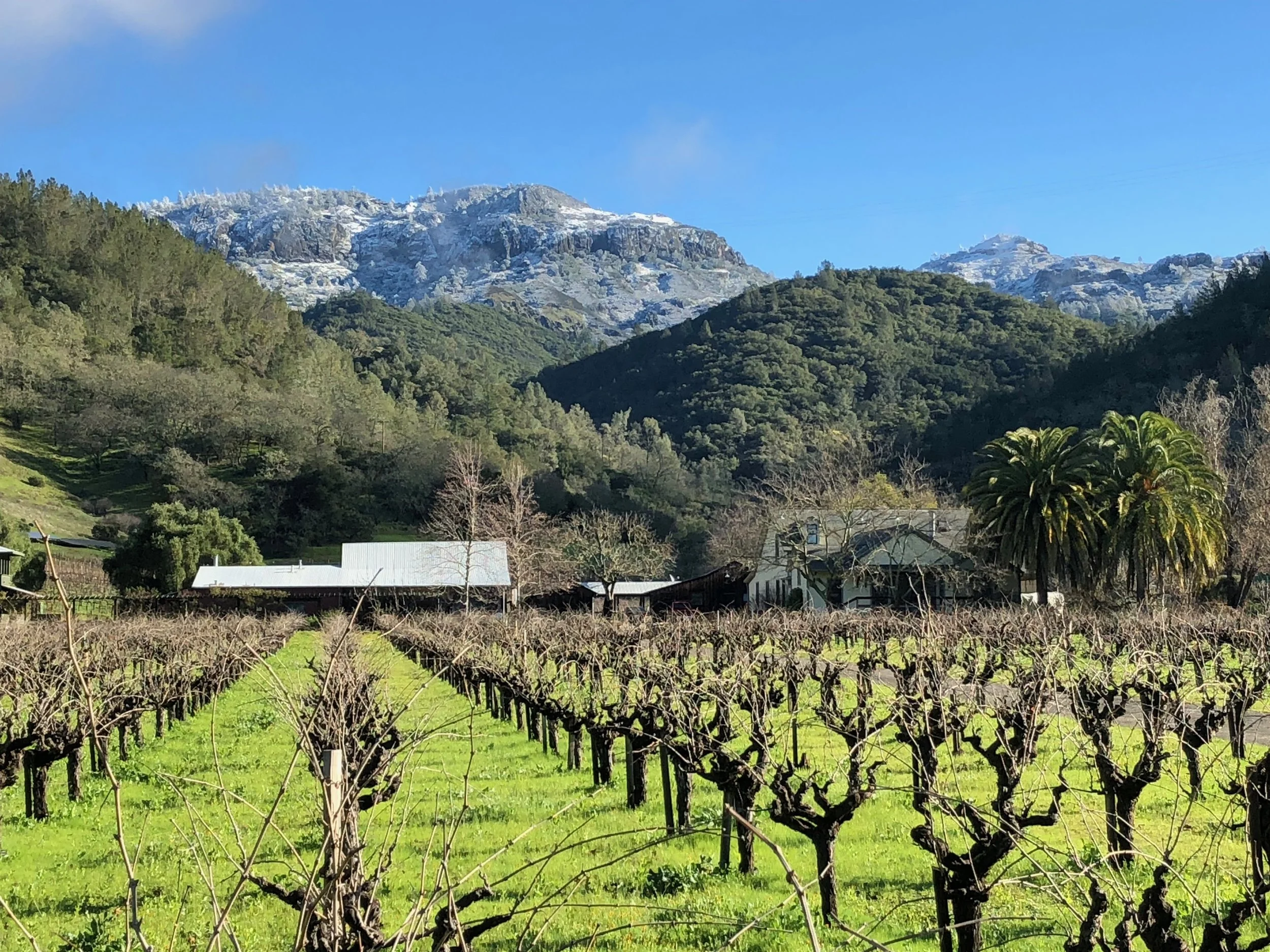 The Palisades above the vineyard after a rare winter snowfall